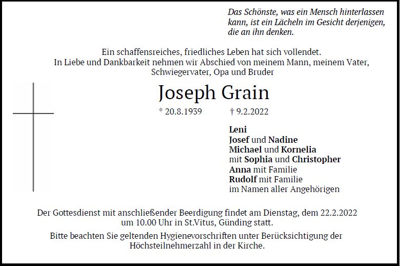 Gottesdienst am Dienstag, dem 22. Februar 2022, um 10:00 Uhr in St. Vitus Beerdigung am Dienstag, dem 22. Februar 2022, um 10:45 Uhr im Friedhof Günding.