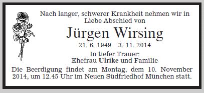 Beerdigung am Montag, dem 10. November 2014, um 12:45 Uhr im Münchner Neuen Südfriedhof