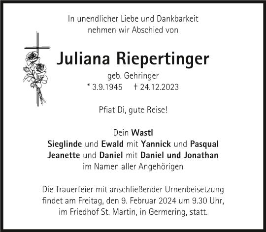 Wir trauern um Frau Juliana Riepertinger geb. Gehringer Verwaltungsangestellte i. R. * 03.09.1945 † 24.12.2023 |