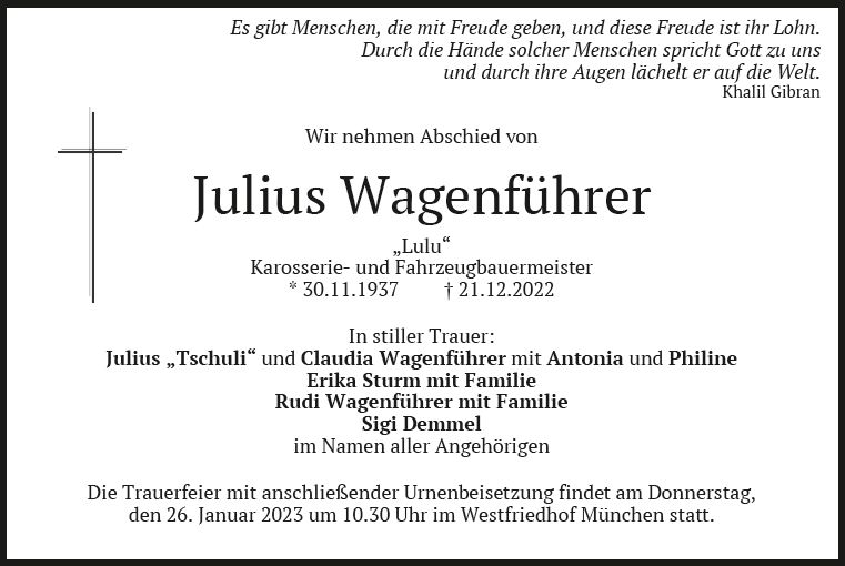 Die Trauerfeier mit anschließender Urnenbeisetzung findet am Donnerstag, den 26. Januar 2023 um 10.30 Uhr im Westfriedhof München statt. |