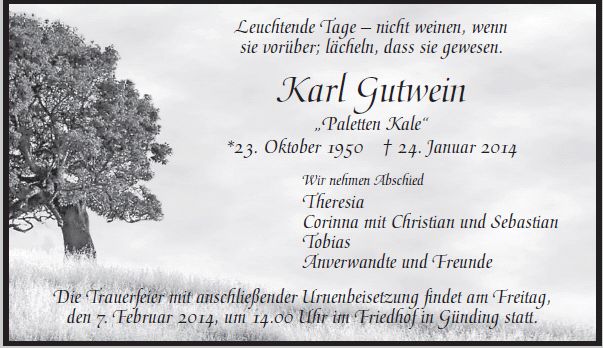 Feierliche Urnenbeisetzung am Freitag, dem 7. Februar 2014, um 14:15 Uhr im Friedhof in Günding