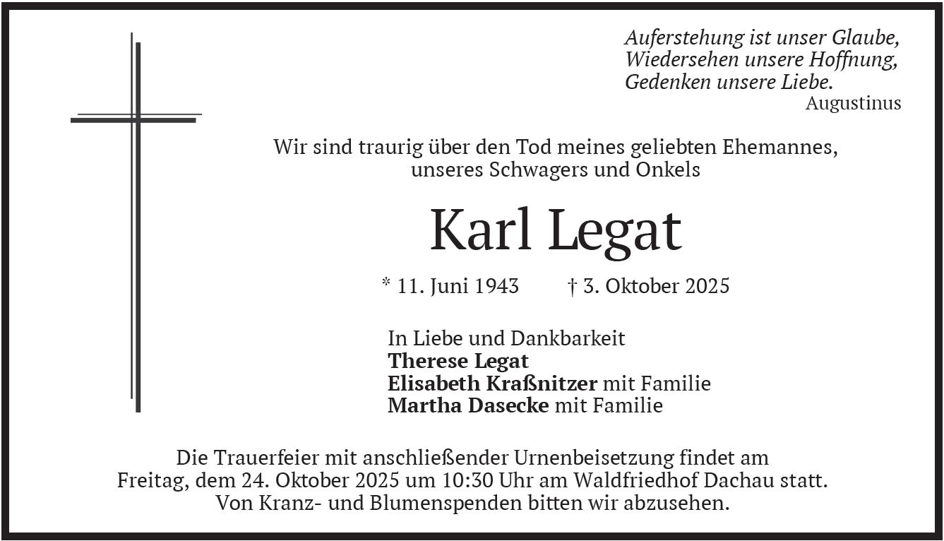 Trauerfeier am Freitag, dem 24. Oktober 2025, um 10:30 Uhr im Dachauer Waldfriedhof Beisetzung anschließend im Dachauer Waldfriedhof