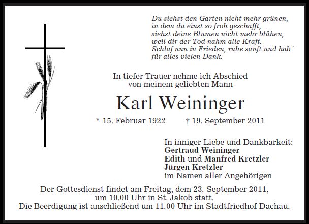 Gottesdienst am Freitag, dem 23. September 2011, um 10:00 Uhr in St. Jakob Dachau. Beerdigung anschließend um 11:00 Uhr im Dachauer Stadtfriedhof. |