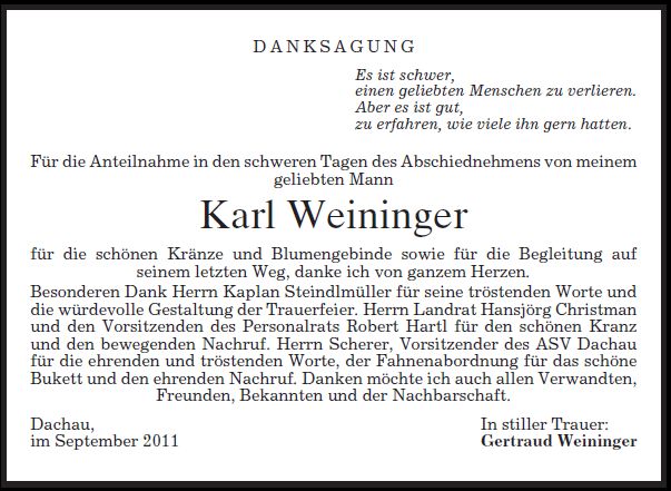 Wir trauern um Herrn Karl Weininger Regierungsbeamter * 15.02.1922 † 19.09.2011 |