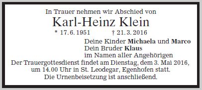 Wir trauern um Herrn Karl Heinz Klein Maler * 17.06.1951 † 21.03.2016 |