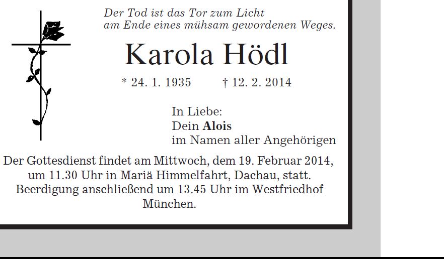Gottesdienst am Mittwoch, dem 19. Februar 2014, um 11:30 Uhr in Maria Himmelfahrt Beerdigung anschließend um 13:45 Uhr im Westfriedhof München