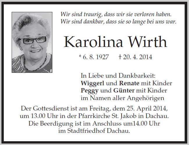 Gottesdienst am Freitag, dem 25. April 2014, um 13:00 Uhr in St. Jakob, Dachau Beerdigung am Freitag, dem 25. April 2014, um 14:00 Uhr im Dachauer Stadtfriedhof