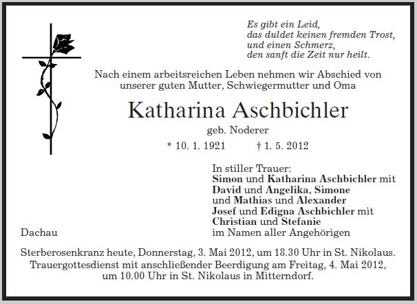 Rosenkranz am Donnerstag, dem 3. Mai 2012, um 18.30 Uhr in St. Nikolaus in Mitterndorf Trauergottesdienst mit anschließender Beerdigung am Freitag, dem 4. Mai 2012, um 10:00 Uhr in St. Nikolaus in Mitterndorf