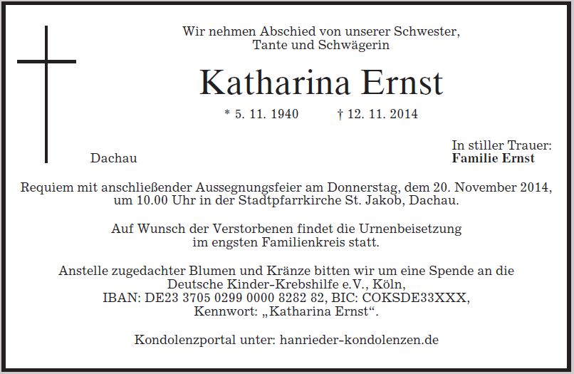 Das Requiem mit anschließender Aussegnungsfeier findet am Donnertstag, dem 20.11.2014 um
