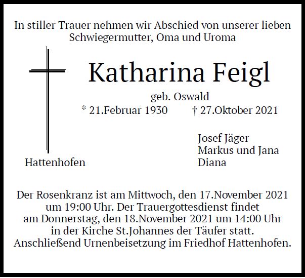 Wir trauern um Frau Katharina Feigl geb. Oswald * 21.02.1930 † 27.10.2021 |