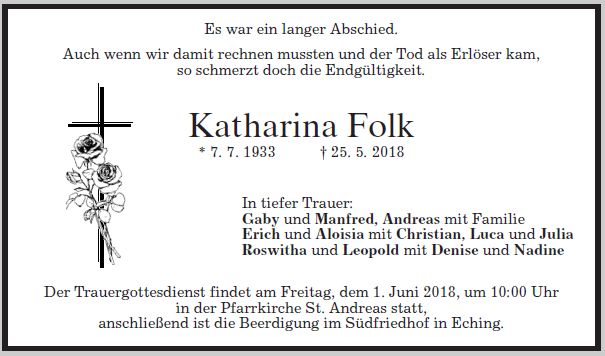 Gottesdienst am Freitag, dem 1. Juni 2018, um 10:00 Uhr in St. Andreas in Eching Beerdigung am Freitag, dem 1. Juni 2018, um 11:00 Uhr im Echinger Südfriedhof