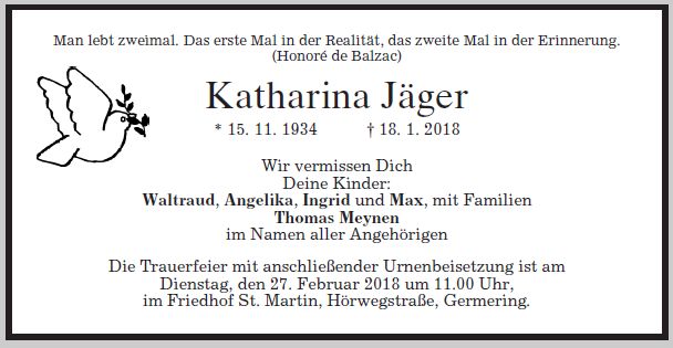 Wir trauern um Frau Katharina Jäger * 15.11.1934 † 18.01.2018 |