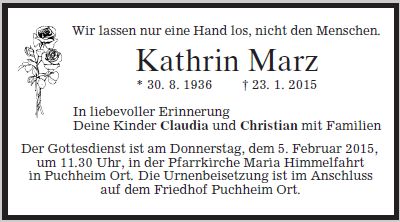 der Gottesdienst ist am Donnerstag, dem 5. Februar 2015, um 11:30 Uhr in Mariä Himmelfahrt, Puchheim Ort Die Beisetzung ist am Donnerstag, dem 5. Februar 2015, im Anschluß, im Friedhof Puchheim - Ort