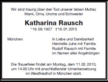 Trauerfeier am Montag, dem 11. Februar 2013, um 14:00 Uhr im Münchner Westfriedhof mit anschließender Urnenbeisetzung |