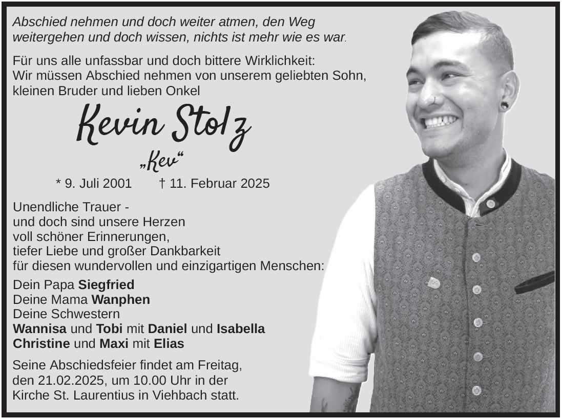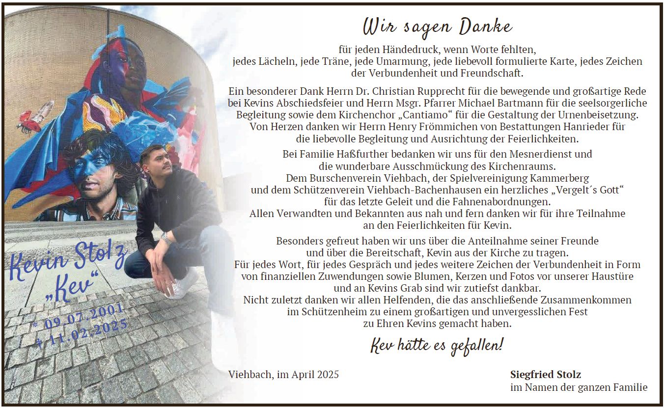 Seine Abschiedsfeier findet am Freitag, dem 21. Februar 2025, um 10:00 Uhr in St. Laurentius, in Viehbach statt. Die Urnenbeisetzung ist zu einem späteren Zeitpunkt im Kreise der Familie.