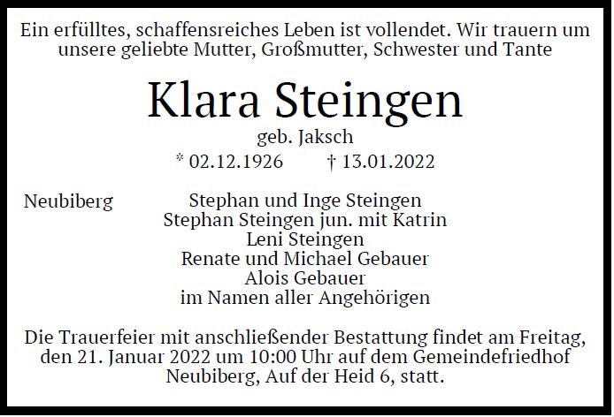 Beerdigung am Freitag, den 21. Januar 2022, um 10:00 Uhr im Friedhof Neubiberg