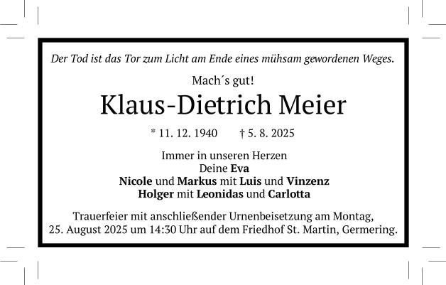 Wir trauern um Herrn Klaus-Dietrich Meier * 11.12.1940 † 05.08.2025 |