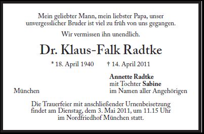 Trauerfeier mit anschließender Urnenbeisetzung am Dienstag, dem 3. Mai 2011, um 11:15 Uhr im Nordfriedhof München.