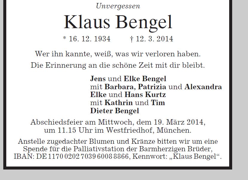 Abschiedsfeier: Mittwoch, den 19. März 2014, um 11:15 Uhr im Westfriedhof München