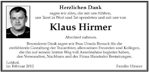 Wir trauern um Herrn Klaus Hirmer Großhandelskaufmann * 09.04.1964 † 05.02.2012 |
