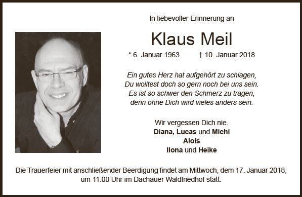 Die Trauerfeier mit anschließender Beerdigung findet am Mittwoch, dem 17. Januar 2018, um 11:00 Uhr im Dachauer Waldfriedhof statt.