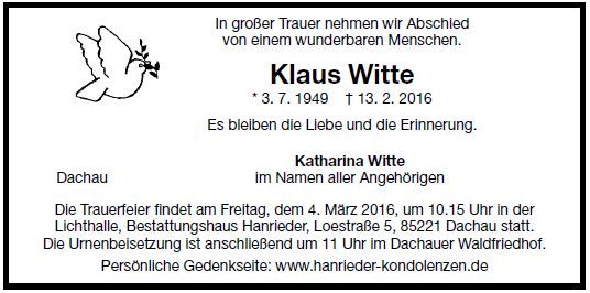 Die Trauerfeier ist am Freitag, dem 4. März 2016, um 10:15 Uhr in der Lichthalle, Hanrieder Bestattungshaus, Loestrasse 5, 85221 Dachau. |