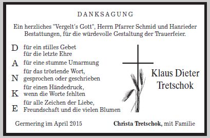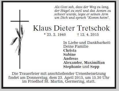 Die Trauerfeier mit anschließender Urnenbeisetzung ist am Donnerstag, dem 23. April 2015, um 15:30 Uhr im Friedhof Germering - St. Martin |