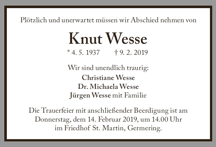 Wir trauern um Herrn Knut Wesse Kaufmann * 04.05.1937 † 09.02.2019 |