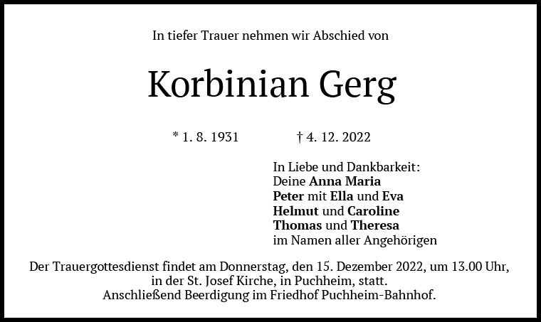 Der Trauergottesdienst findet am Donnerstag, den 15. Dezember 2022 um 13.00 Uhr in der St. Josef Kirche, in Puchheim, statt. Anschließend Beerdigung im Friedhof Puchheim-Bahnhof.