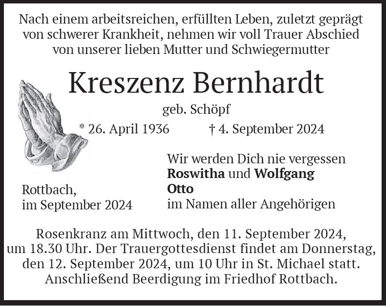 Wir trauern um Frau Kreszenz Bernhardt geb. Schöpf * 26.04.1936 † 04.09.2024 |