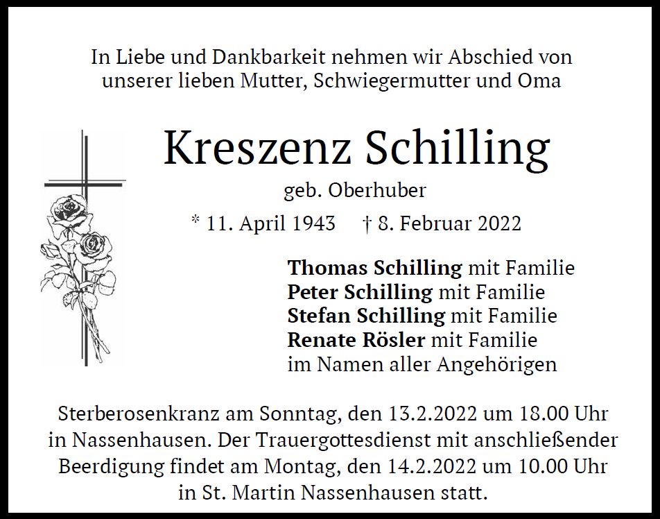 Wir trauern um Frau Kreszenz Schilling geb. Oberhuber * 11.04.1943 † 08.02.2022 |