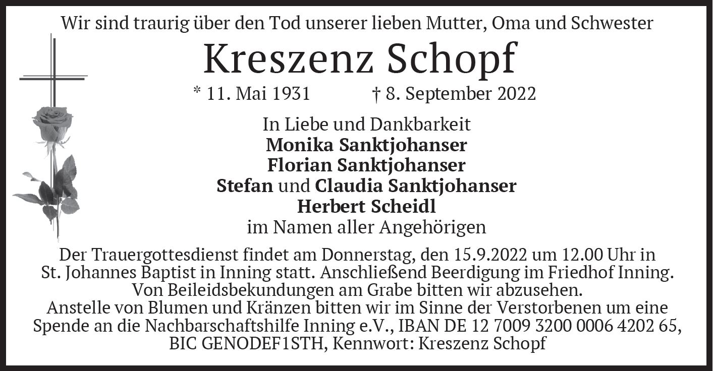 Wir trauern um Frau Kreszenz Schopf geb. Scheidl * 11.05.1931 † 08.09.2022 |
