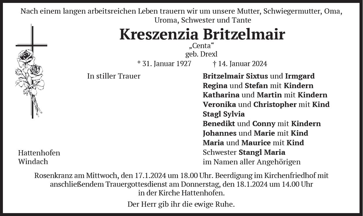 Wir trauern um Frau Kreszenzia Britzelmair geb. Drexl * 31.01.1927 † 14.01.2024 |