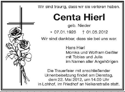 Wir trauern um Frau Kreszenzia Hierl geb. Nieder Verkäuferin * 07.01.1926 † 01.05.2012 |