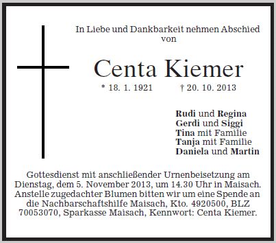 Gottesdienst am Dienstag, 5. November 2013 um 14.30 Uhr in St Vitus in Maisach mit anschließender Urnenbeisetzung