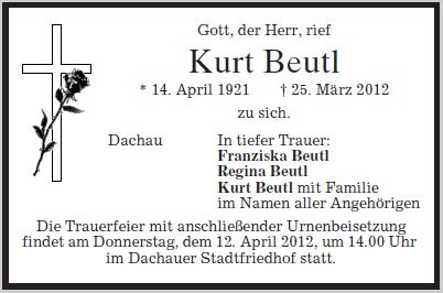 Trauerfeier am Donnerstag, dem 12. April 2012, um 14:00 Uhr im Dachauer Stadtfriedhof mit anschließender Urnenbeisetzung.