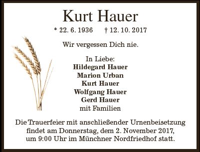 Die Trauerfeier mit anschließender Urnenbeisetzung findet am Donnerstag, dem 2. November 2017, um 09:00 Uhr im Münchner Nordfriedhof statt. |