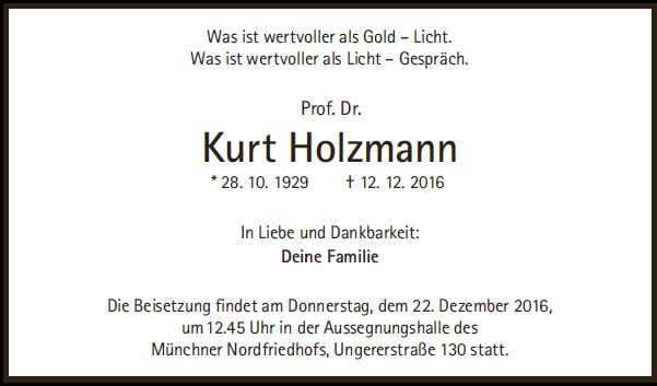 Beerdigung am Donnerstag, dem 22. Dezember 2016, um 12:45 Uhr im Münchner Nordfriedhof.