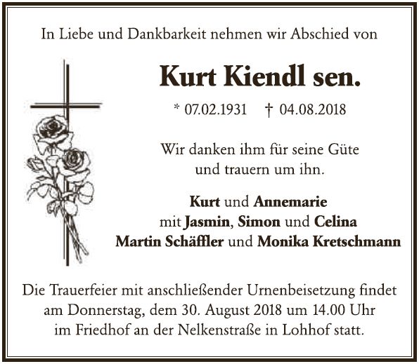 Wir trauern um Herrn Kurt Kiendl Frisör * 07.02.1931 † 04.08.2018 |