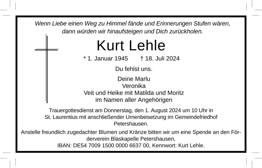 Trauergottesdienst am Donnerstag, den 1. August 2024 um 10 Uhr in St. Laurentius mit anschließender Urnenbeisetzung im Gemeindefriedhof Petershausen.