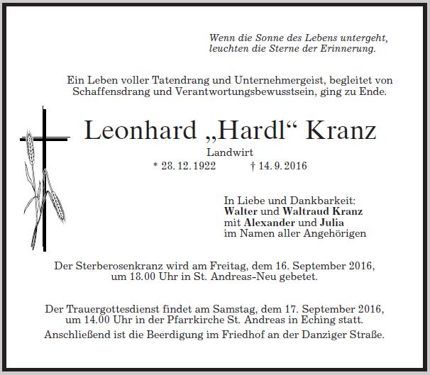 Gottesdienst am Samstag, dem 17. September 2016, um 14:00 Uhr in St. Andreas - Neu Beerdigung am Samstag, dem 17. September 2016, um 14:45 Uhr im Friedhof Eching Danziger Straße