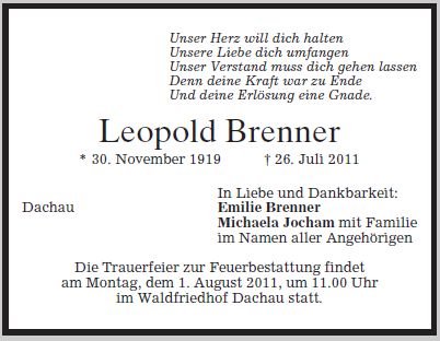 Trauerfeier zur Feuerbestattung am Montag, dem 1. August 2011, um 11:00 Uhr im Waldfriedhof Dachau.
