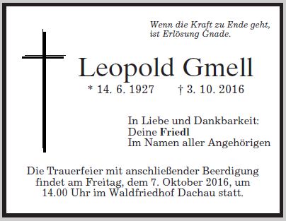 Trauerfeier mit anschließender Beerdigung am Freitag, dem 7. Oktober 2016, um 14:00 Uhr im Dachauer Waldfriedhof