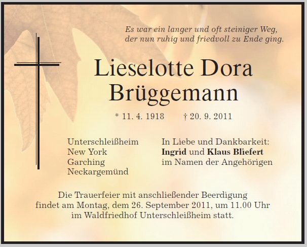 Wir trauern um Frau Lieselotte Brüggemann geb. Gnitzinger Kindergärtnerin * 11.04.1918 † 20.09.2011 |