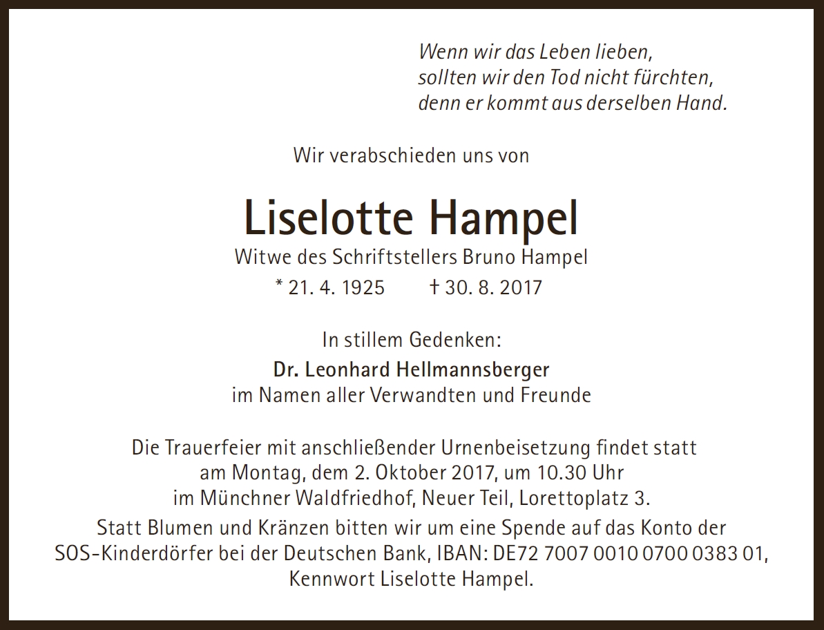 Wir trauern um Frau Liselotte Hampel Witwe des Schriftstellers Bruno Hampel * 21.04.1925 † 30.08.2017 |