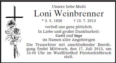 Trauerfeier am Mittwoch, dem 17. Juli 2013, um 10:00 Uhr im Fürstenfeldbruck Waldfriedhof, anschließend die Beerdigung. |