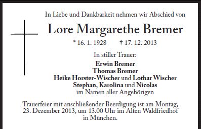 Trauerfeier am Montag, dem 23. Dezember 2013, um 13:00 Uhr im Münchner Waldfriedhof Alter Teil, anschließend die Beerdigung.