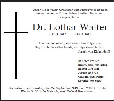 Gottesdienst am Dienstag, dem 24. September 2013, um 12:30 Uhr in St. Vitus in Maisach, anschließend die Beerdigung.