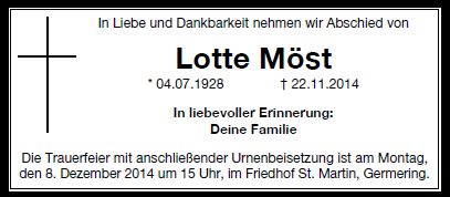 Die Trauerfeier ist am Montag, dem 8. Dezember 2014, um 15:00 Uhr im Friedhof St. Martin, Germering Die Beisetzung ist am Montag, dem 8. Dezember 2014, im Anschluß im Friedhof St. Martin, Germering