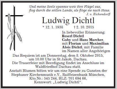 Das Requiem ist am Donnerstag, den 8. Oktober 2015 um 10.00 Uhr in der Pfarrkirche St. Jakob, Dachau Die Trauerfeier mit anschießender Beerdigung ist am Donnerstag den 8. Oktober 2015 um 11.30 Uhr, im Waldfriedhof Dachau